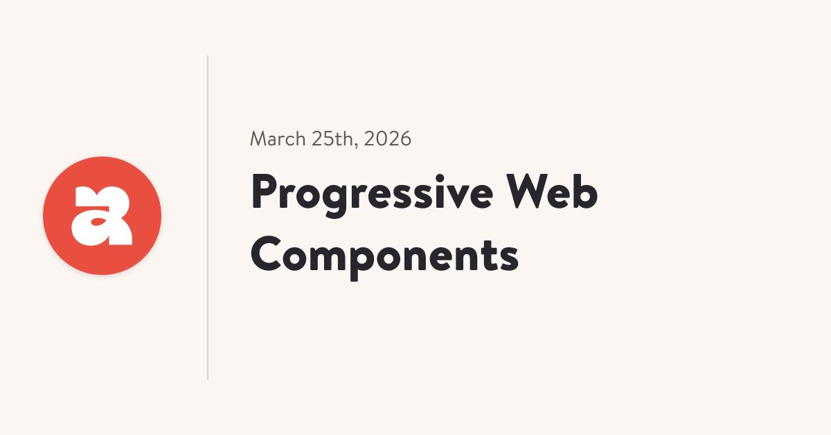 A Progressive Web Component is a native Custom Element designed in two layers: a base layer of HTML and CSS that renders immediately, without JavaScript, and an enhancement layer of JavaScript that adds reactivity, event handling, and more advanced templating. There are three types of Progressive Web Components: