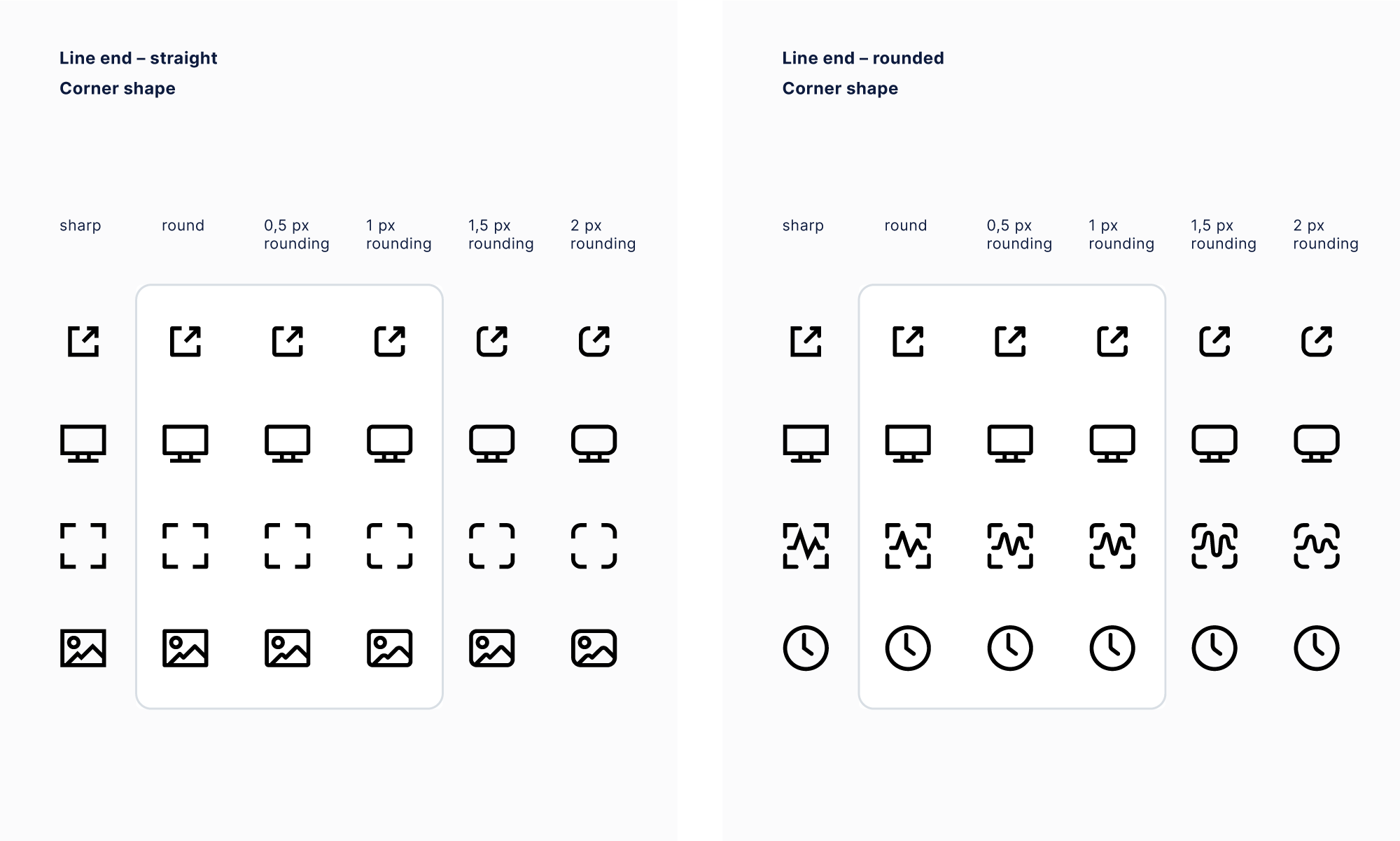 First, we defined the general icon style. We had already made the decision to keep the line icon style, as it’s a clear and versatile, so we started by trying different corner radiuses and line end variations.