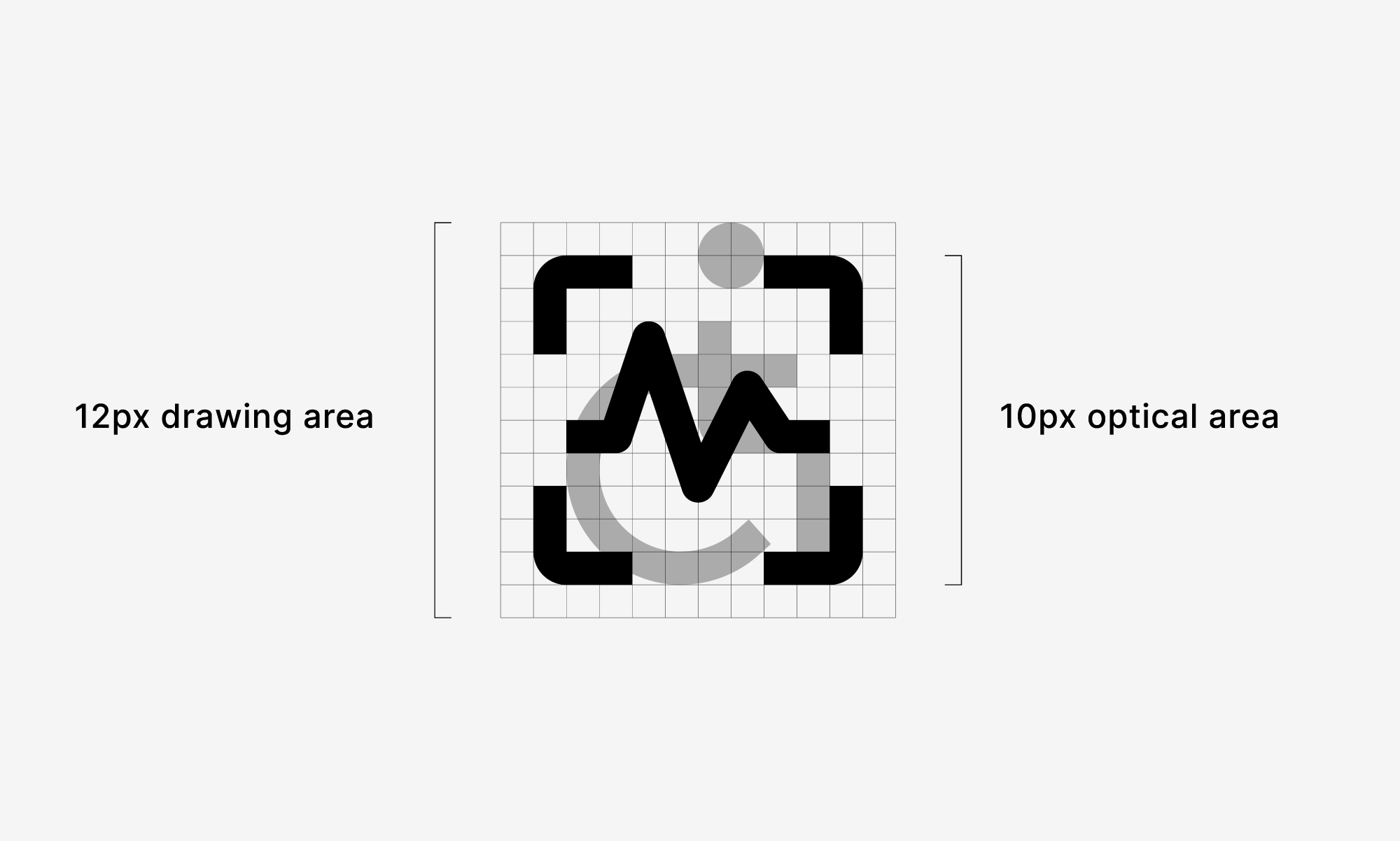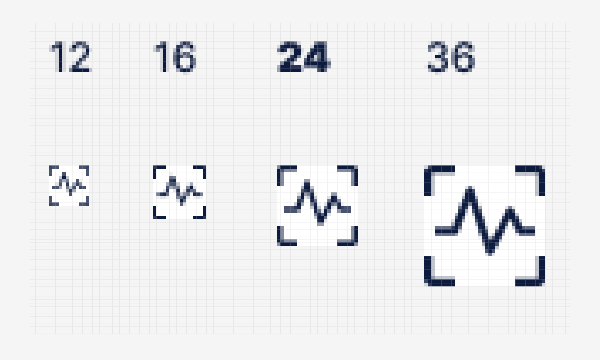 We tested mainly 10x10, 12x12, 20x20 and 24x24 pixel grids. Even 11x11 at one point, but in the end we settled on 10x10 as it seemed to look the best next to Inter typeface used throughout the design system.